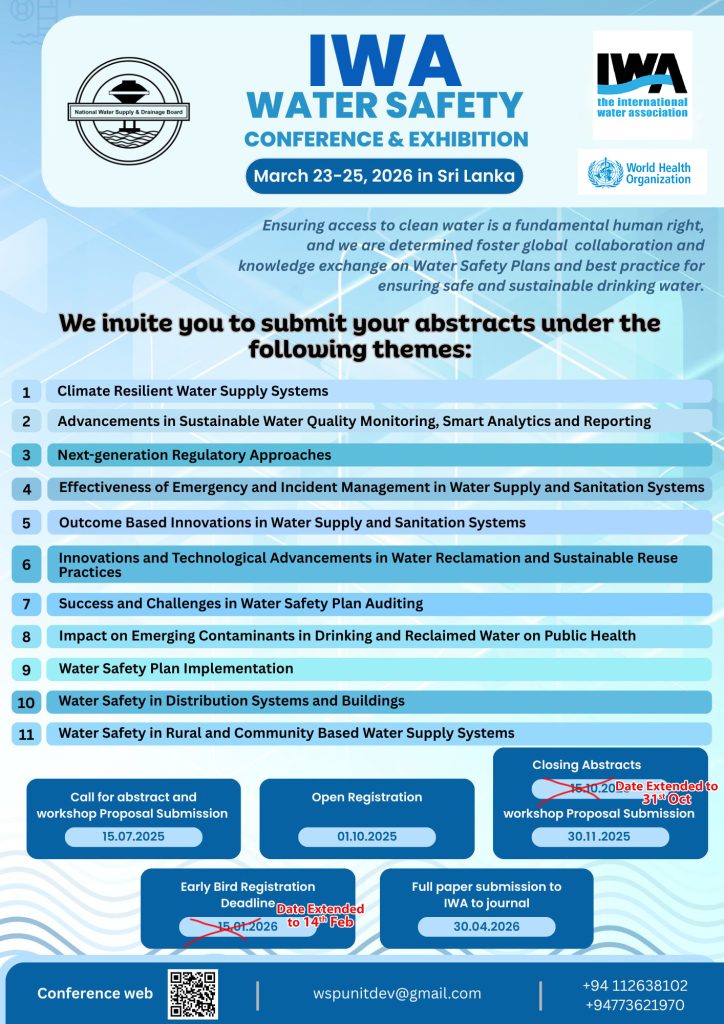 The National Water Supply and Drainage Board proudly invites you to the 2026 IWA International Water Safety Conference and Exhibition.