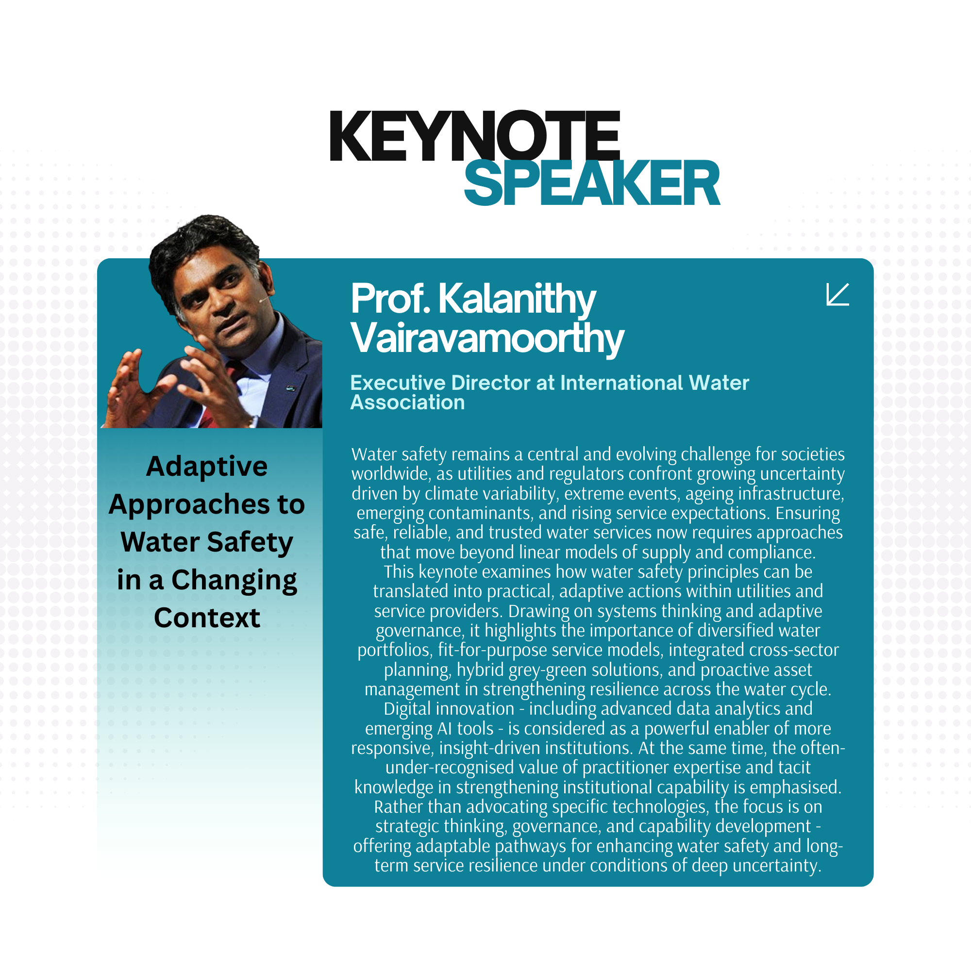 As the globally recognized best practice for ensuring the safety and reliability of drinking water supplies, Water Safety Plans (WSPs) play a vital role in protecting public health. In these uncertain times, sharing experiences and lessons learned is more crucial than ever. The 2026 IWA–WSCE will place special emphasis on recent advancements and innovations in water safety planning.