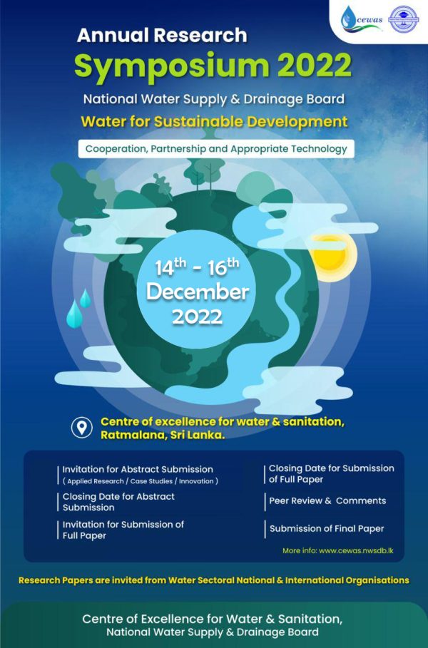 This year, the Seventh Research and Development Symposium has been scheduled to be held on 18th November 2022 at the newly established Centre of Knowledge at Rathmalana. The theme of the event is ‘Water for sustainable development: Cooperation, Partnership, and Appropriate Technology. It has been planned to call for papers from NWSDB as well as local and international water sector institutes.