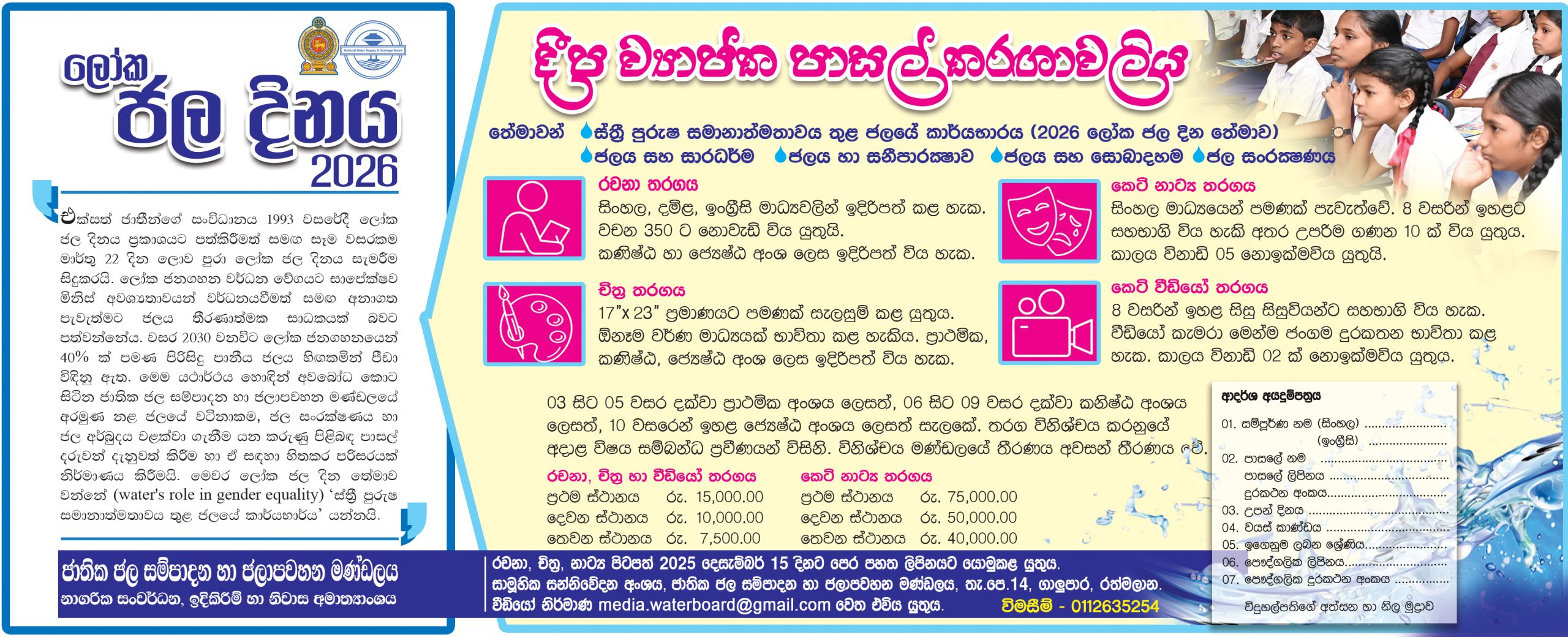 පාසල් තරග සදහා තේමාව – “තිරසාර ජලය සහ අපජලය කළමණාකරණය: නවෝත්පාදන, පර්යේෂණ, ඩිජිටල්කරණය සහ අනාගතය සඳහා ඔරොත්තු දීමේ හැකියාව”