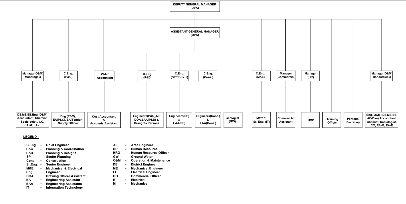 The RSC is headed by the Deputy General Manager (Uva) with the guidance of Additional General Manager (E/S/U), who is also stationed in the same premises. All Planning & Design works related to the province are carried out by the P&D, M&E and Sector Planning sections, while all the major and minor construction supervisions are done by construction section with the help of Regional Mangers under the guidance of the Assistant General Manager (AGM). Both DGM and AGM are looking after the operations and maintenance (O&M) in addition to the development functions.